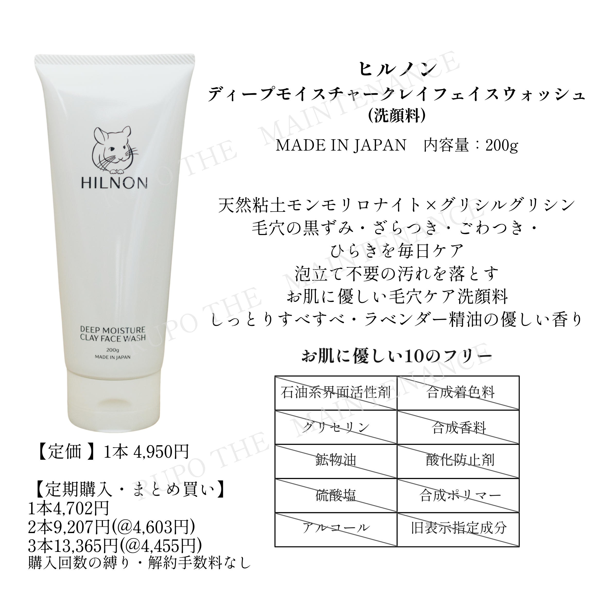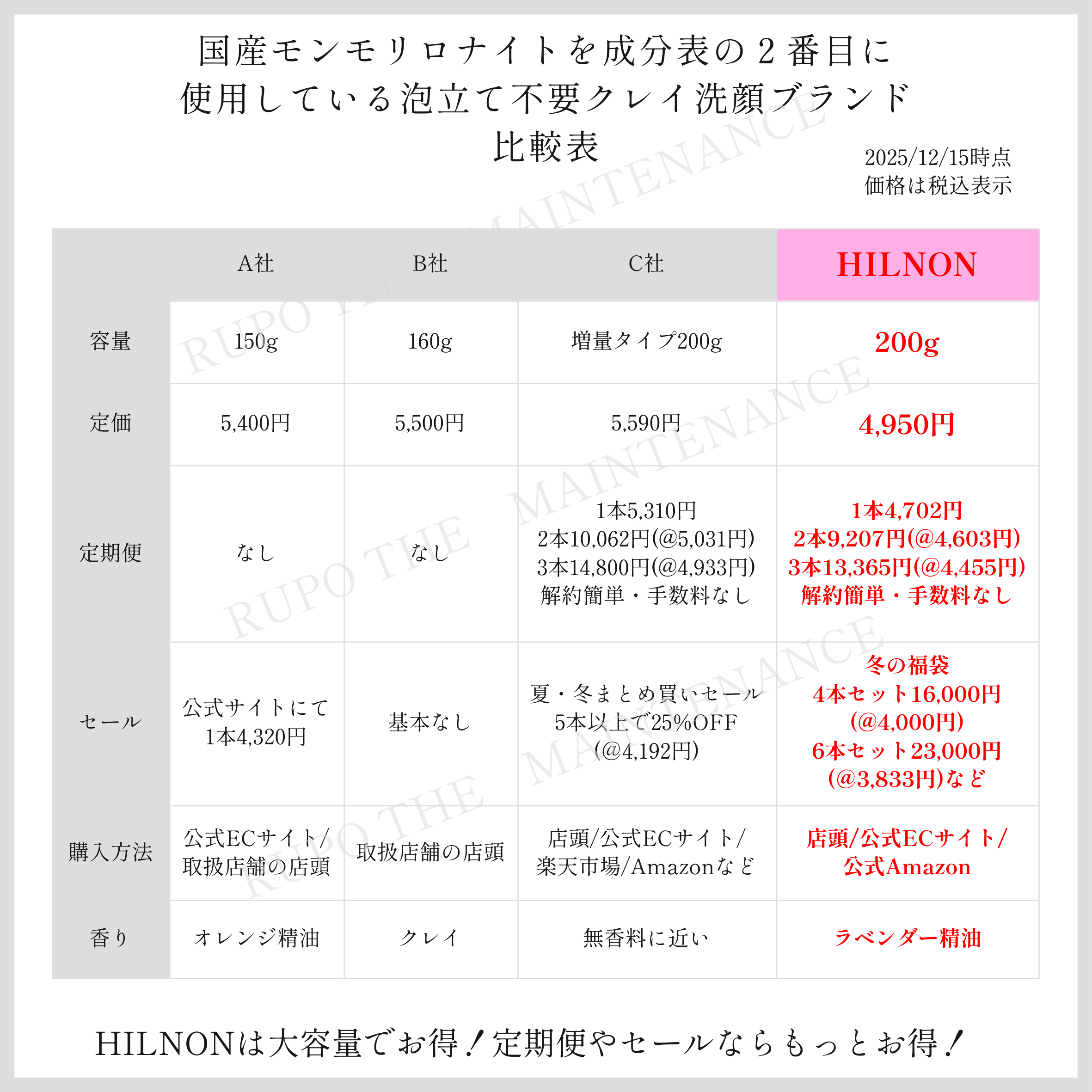 →HILNONは製造会社と打ち合わせから商品発送まで中間コストをかけずに直接行っております。唯一委託していることはAmazonご注分の発送ですが、低コストで発送していただいています。これにより天然界面活性剤を使用し、なおかつ国産クレイ・モンモリロナイトの含有量が多い泡立て不要洗顔の中でも、HILNONは品質を保ちながら大容量で低価格を実現しました。(下記の比較表をご覧ください。)