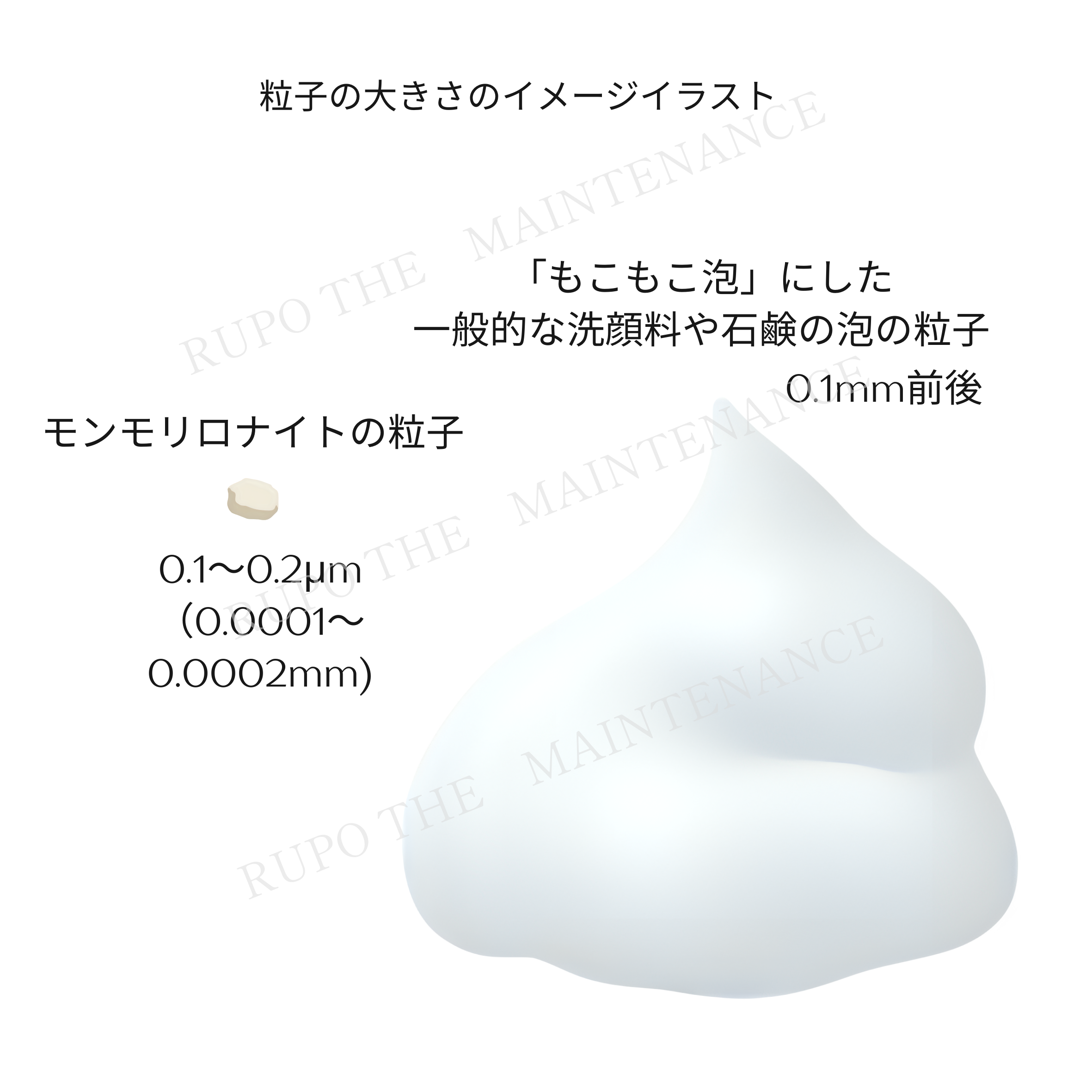 そんなモンモリロナイトの結晶体はなんと0.1 〜0.2μm(マイクロメートル)の超微粒子!なので肌を傷めず汚れを取り除くことができます。毛穴の大きさは0.2〜0.4mm前後。石鹸の粒子は0.1mm前後と言われています。